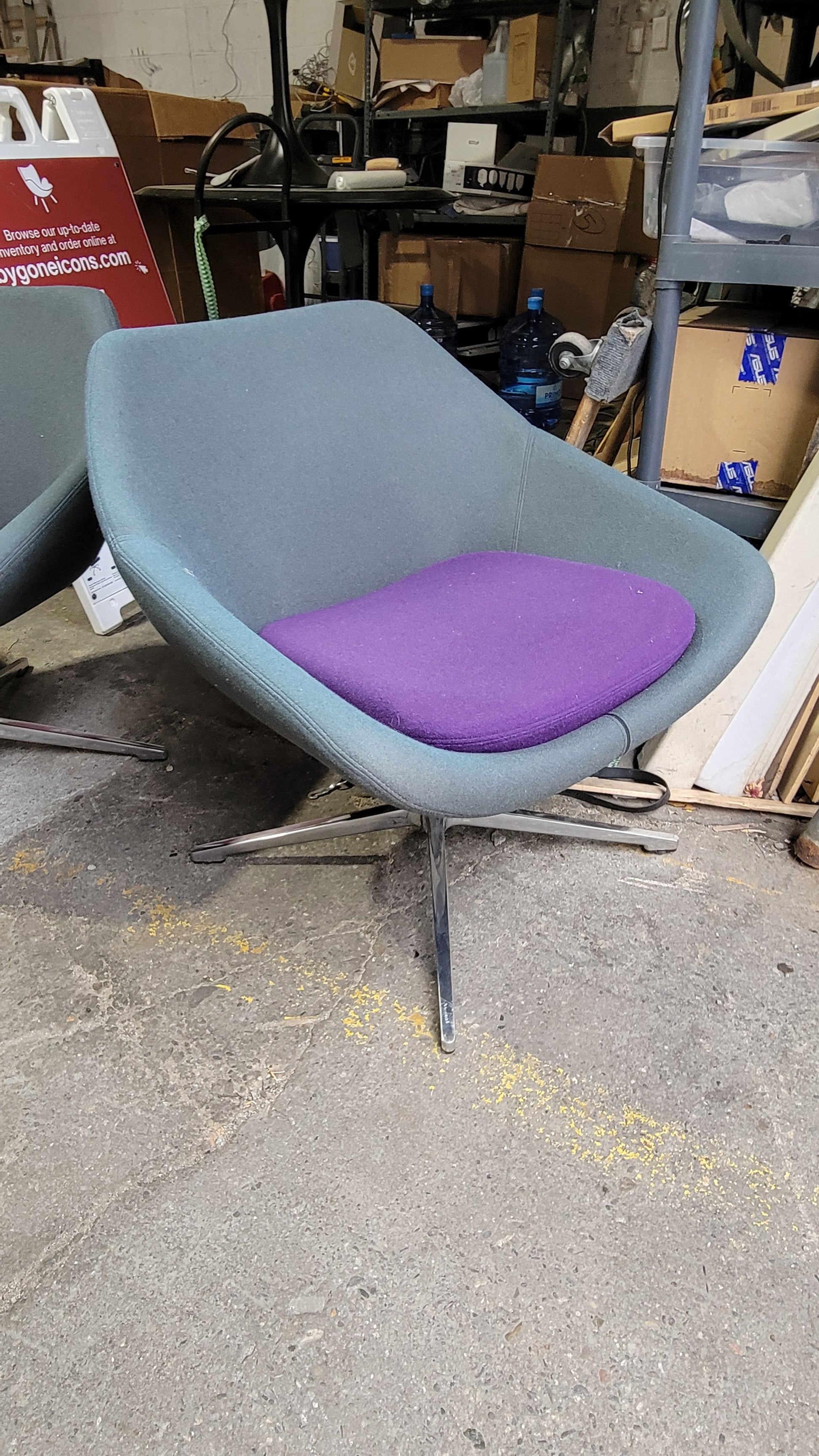 The Allermuir Conic Lounge Chair, model A640, combines sculptural design with exceptional comfort. Featuring a smooth, wraparound shell upholstered in blue fabric with a contrasting purple seat cushion, it rests on a polished aluminum 4-star swivel base.