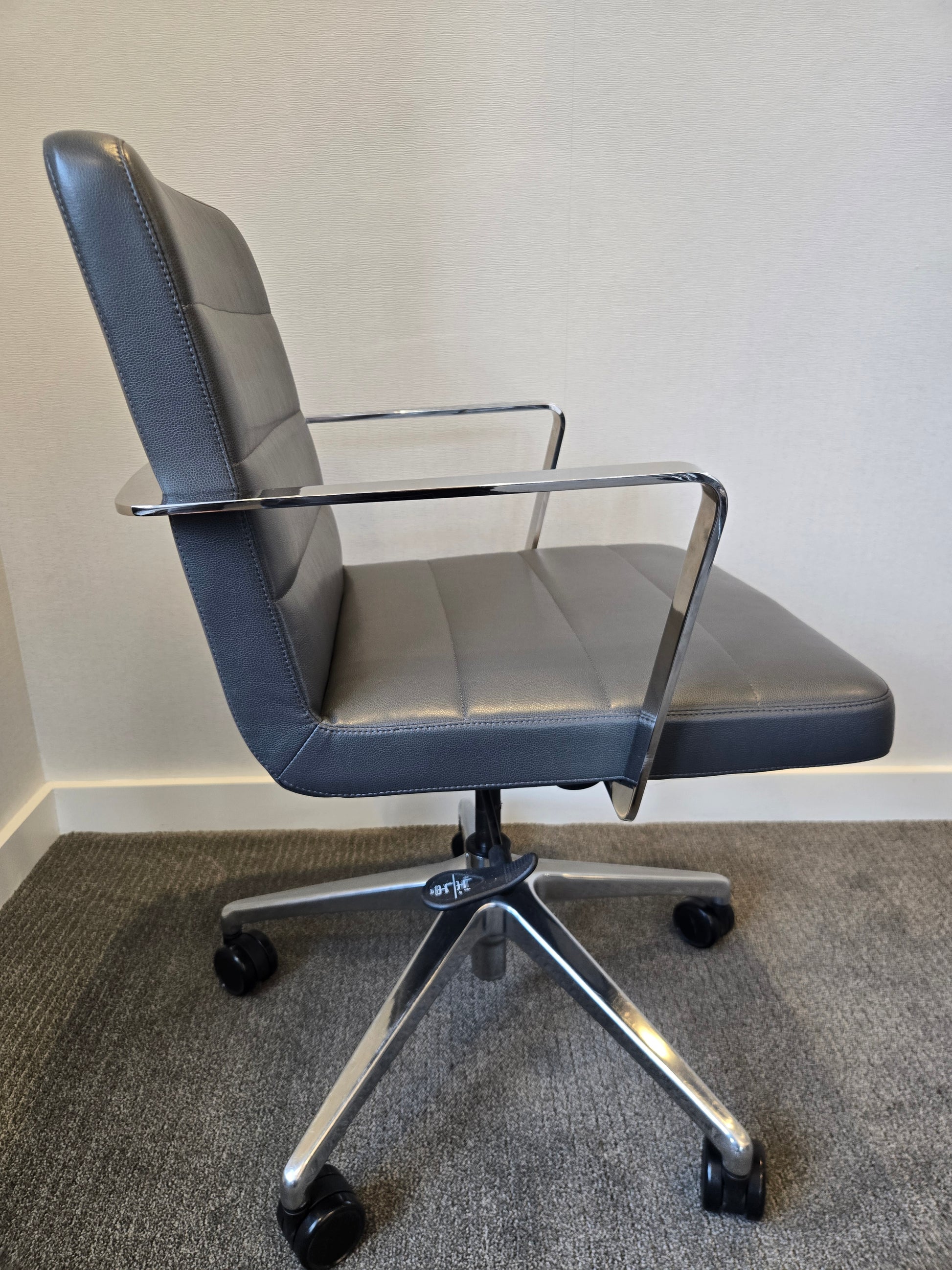 The Bernhardt Design Duet Conference Chair in grey blends contemporary minimalism with refined comfort. Its sculpted seat and back create a smooth, continuous silhouette that supports the body naturally, while the slim profile offers an elegant presence around conference tables, workspaces, or meeting areas.