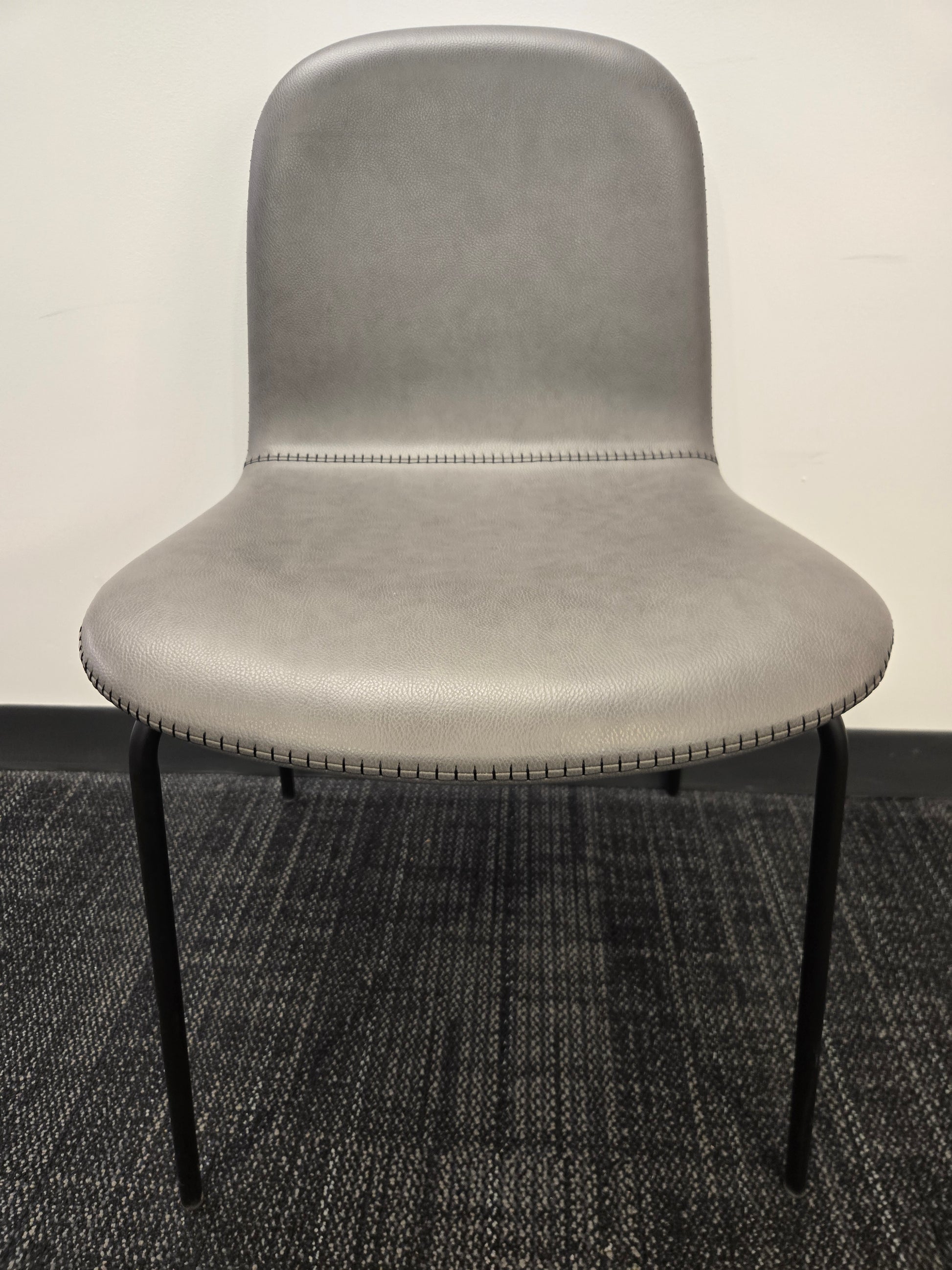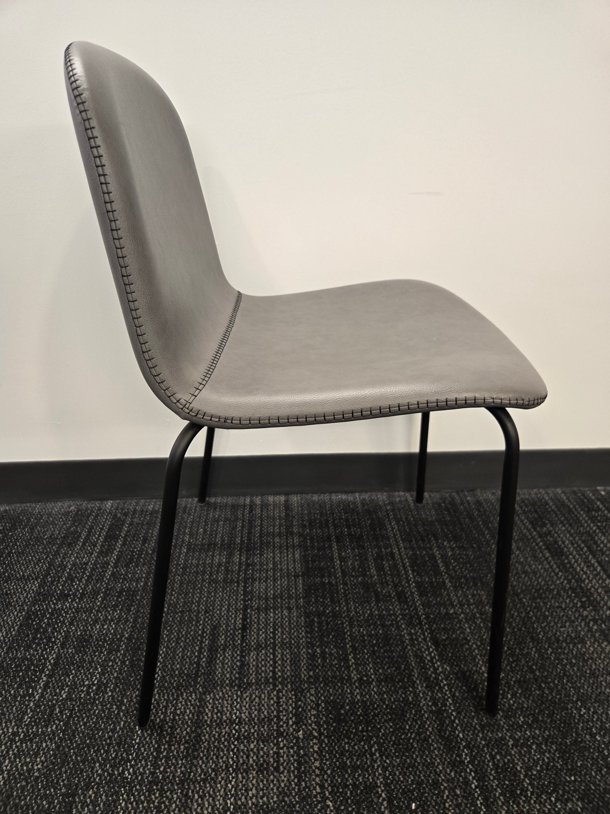 The CB2 Primitivo Chair in grey faux leather features a bold, sculptural silhouette that brings a modern edge to any space. Defined by its curved back and integrated arms, the chair offers a comfortable, enveloping seat with a compact footprint that works well in both residential and commercial settings.