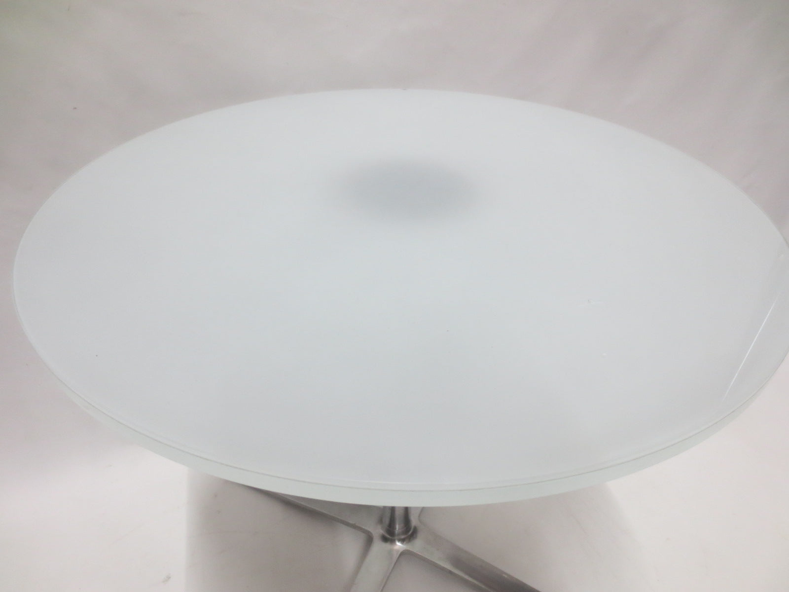 The Coalesse Bob Round Glass Top Coffee Table is a modern and elegant piece of furniture, known for its sleek design. It measures 30 inches in diameter and 22 inches in height.