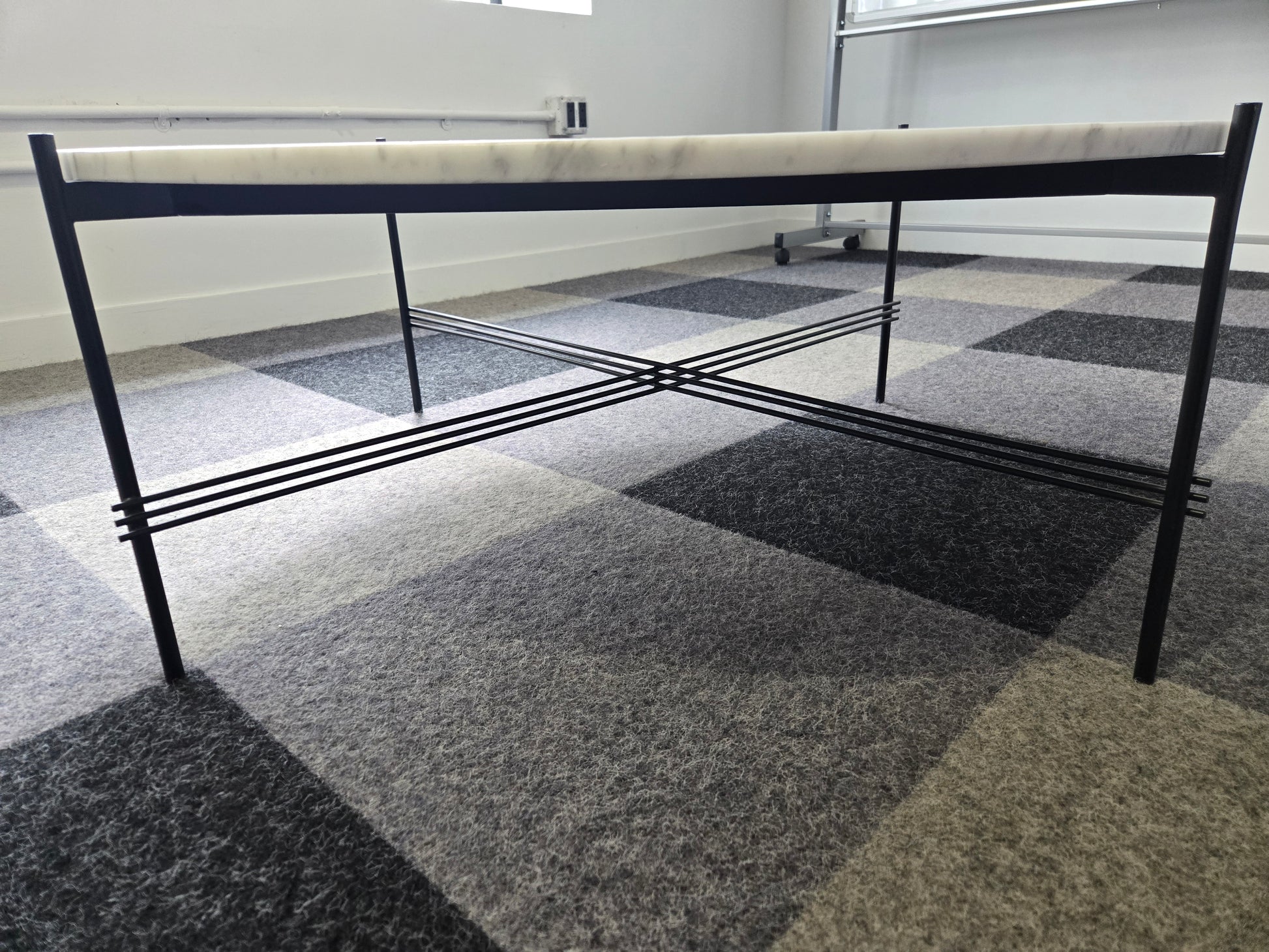 The base consists of slender metal legs that intersect in a geometric pattern, creating a sense of balance and lightness beneath the weight of the stone top. With its clean lines and rich material contrast, the TS table works beautifully as a centerpiece in modern living rooms, lounges, or upscale commercial interiors.