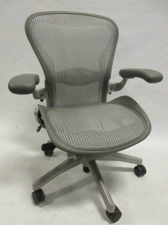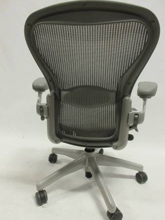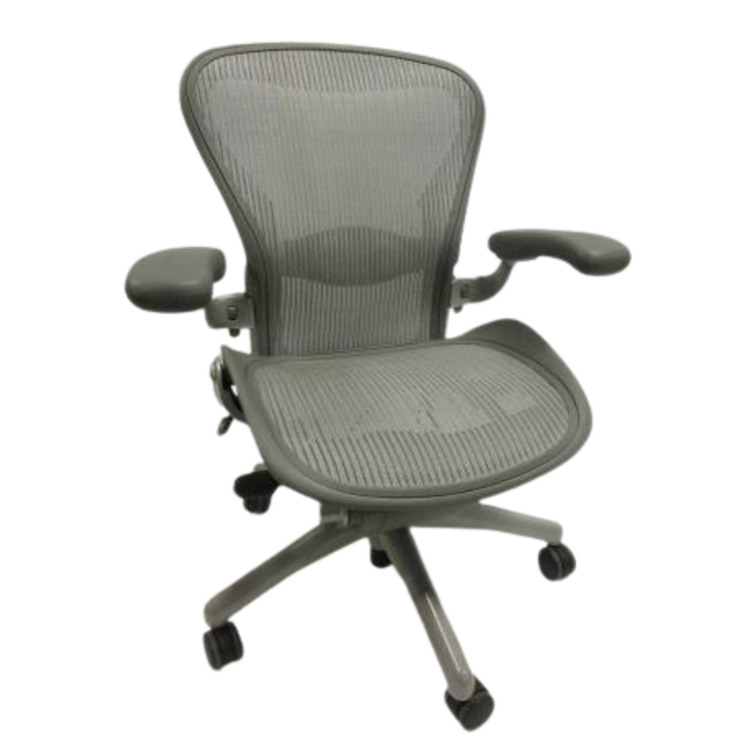 The Herman Miller Aeron Chair in Size B, finished in Titanium, offers iconic ergonomic design paired with a sleek, modern look. This chair is fully adjustable, including forward tilt, tilt lock, adjustable height arms, pivoting armrests, and an adjustable lumbar pad for lower back support.
