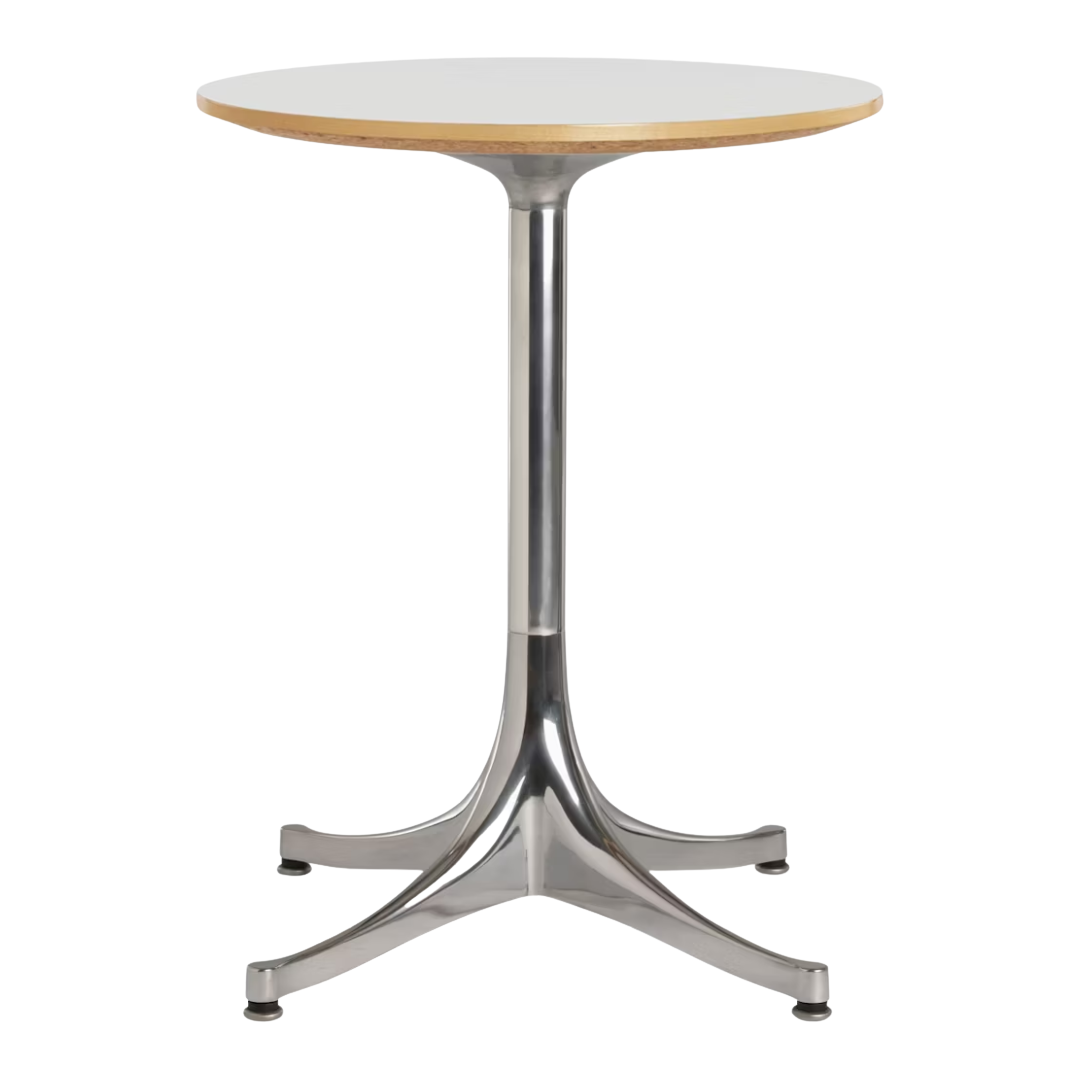 The Herman Miller Nelson Pedestal Side Table in White is a minimalist classic designed by George Nelson in 1954. This elegant side table features a smooth, white laminate top set on a slender yet sturdy pedestal base.