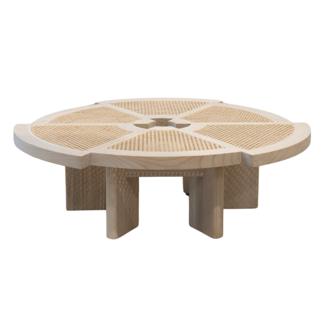 The K30 Coffee Table showcases a striking circular design with segmented cane inlays framed by solid wood. Its geometric base provides stability while adding sculptural presence, making it as functional as it is artistic.