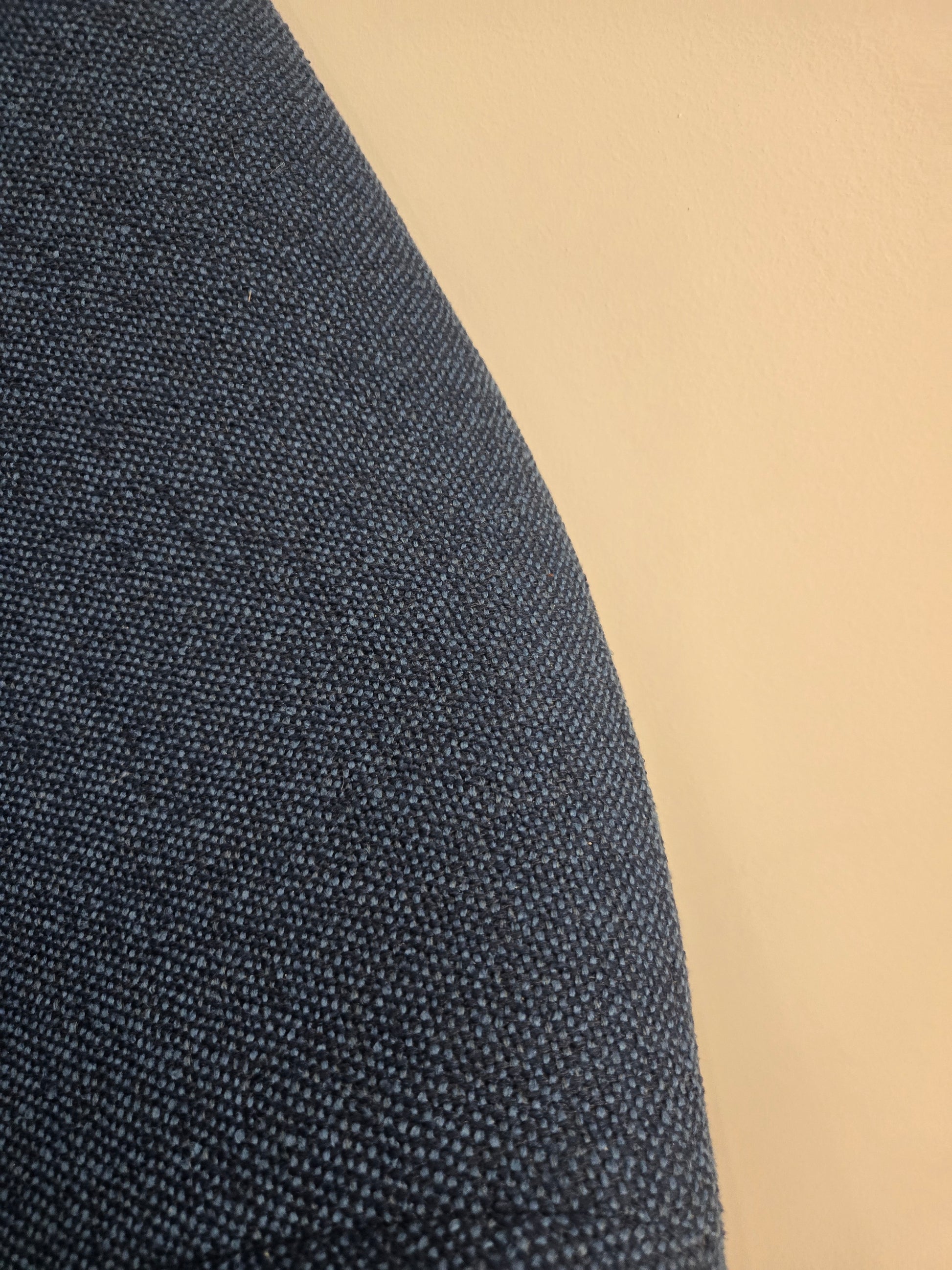 Upholstered in durable blue fabric, the plush seat and supportive backrest are paired with a low, grounded profile that works well in offices, collaborative spaces, or residential living areas.