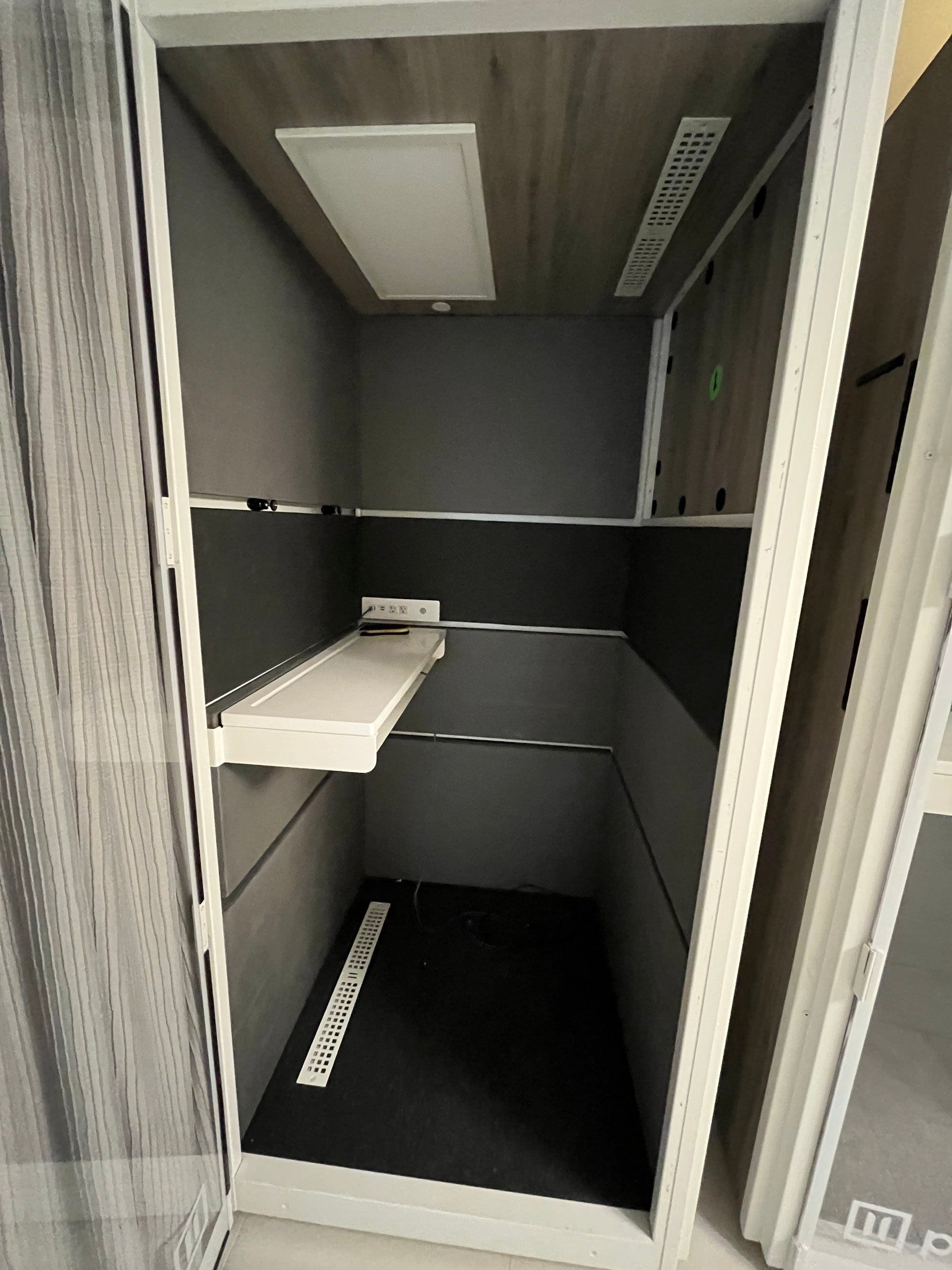 Built with sound-absorbing materials to reduce surrounding noise, it helps carve out true privacy in open offices, studios, and shared spaces. The interior measures 36.4” W x 39.2” D x 81” H, giving users a spacious yet efficient personal workspace, while the exterior footprint is 42.5” W x 42.5” D x 89.8” H, extending to 44.5” deep with the handle and 79” deep with the door open.