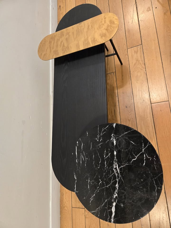 The Tradition Palette JH7 Coffee Table, designed by Jaime Hayon, is a sculptural and playful piece that combines artistic form with functional design. It features three contrasting surfaces—black-stained ash wood, polished Nero Marquina marble, and satin brass—each set at different heights.