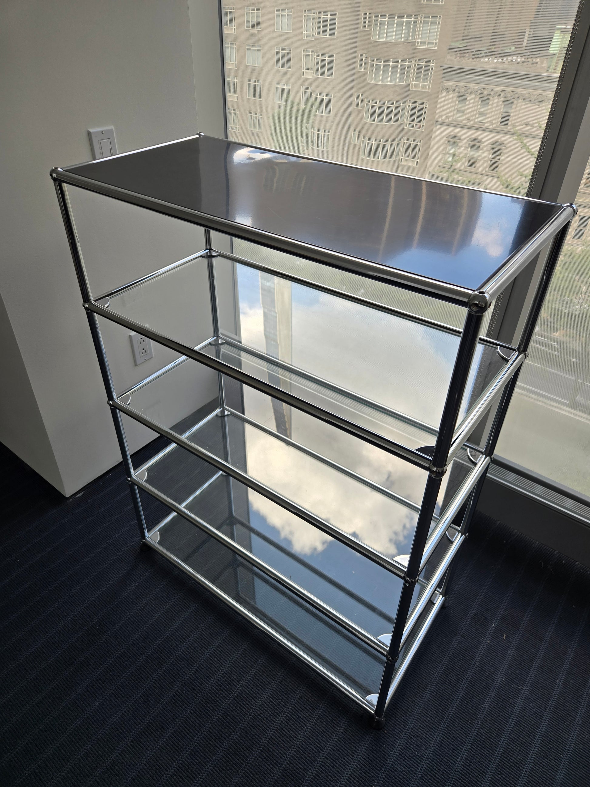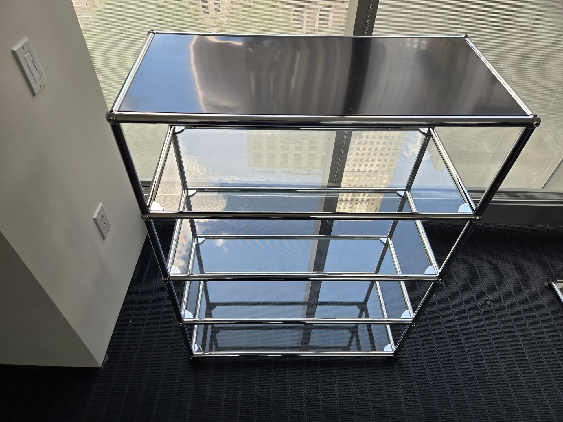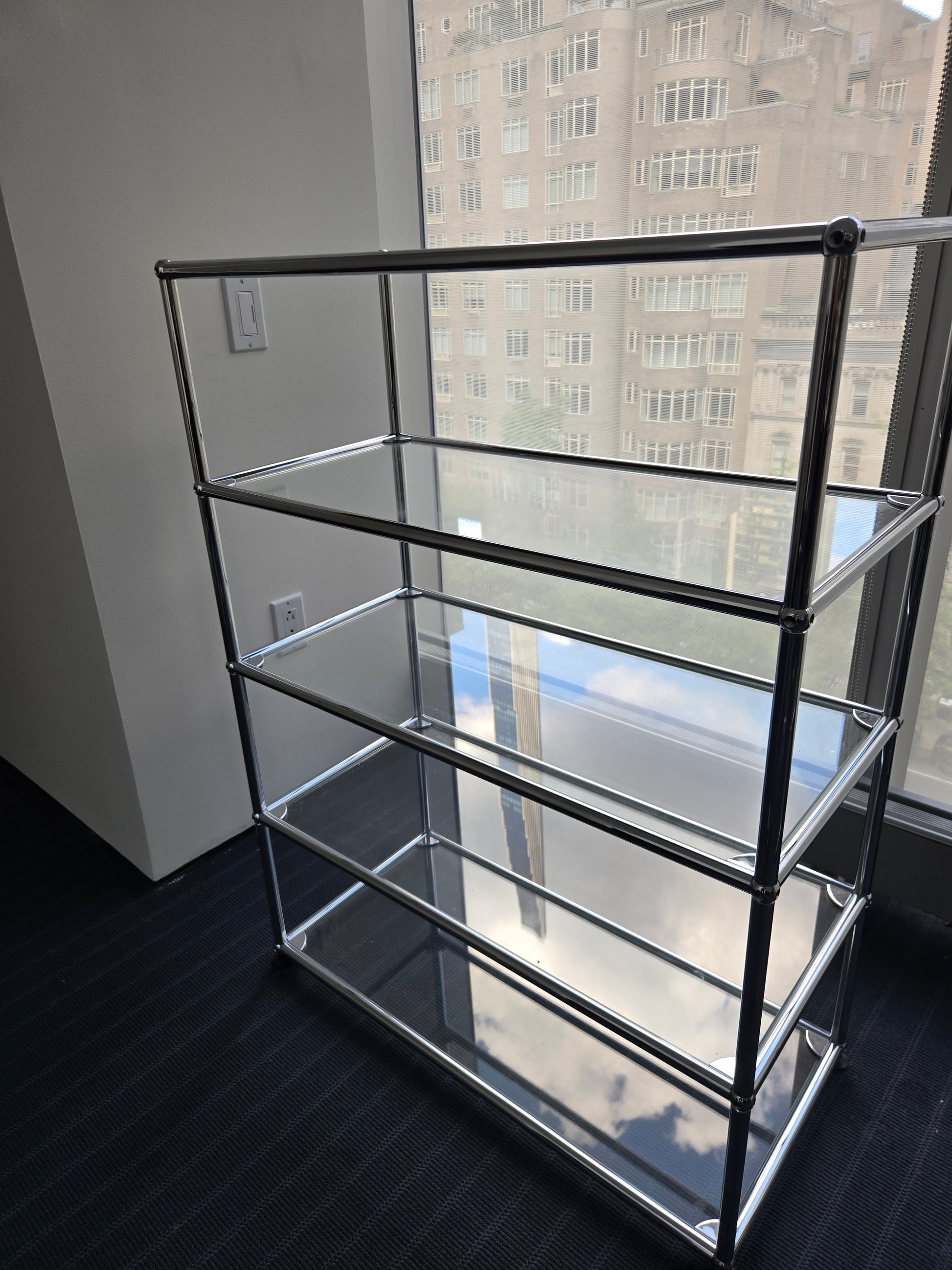 The USM Haller 1x4 4-Shelf Bookcase in Glass with a Black Top is a refined example of the iconic modular system designed by Fritz Haller and Paul Schärer. Built on USM’s signature chrome-plated steel frame with precision ball-joint connectors, this configuration uses transparent glass shelves that give the piece a light, architectural quality while maintaining strength and stability.