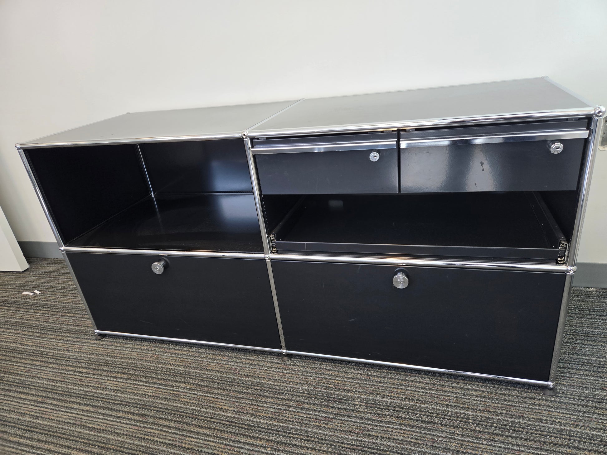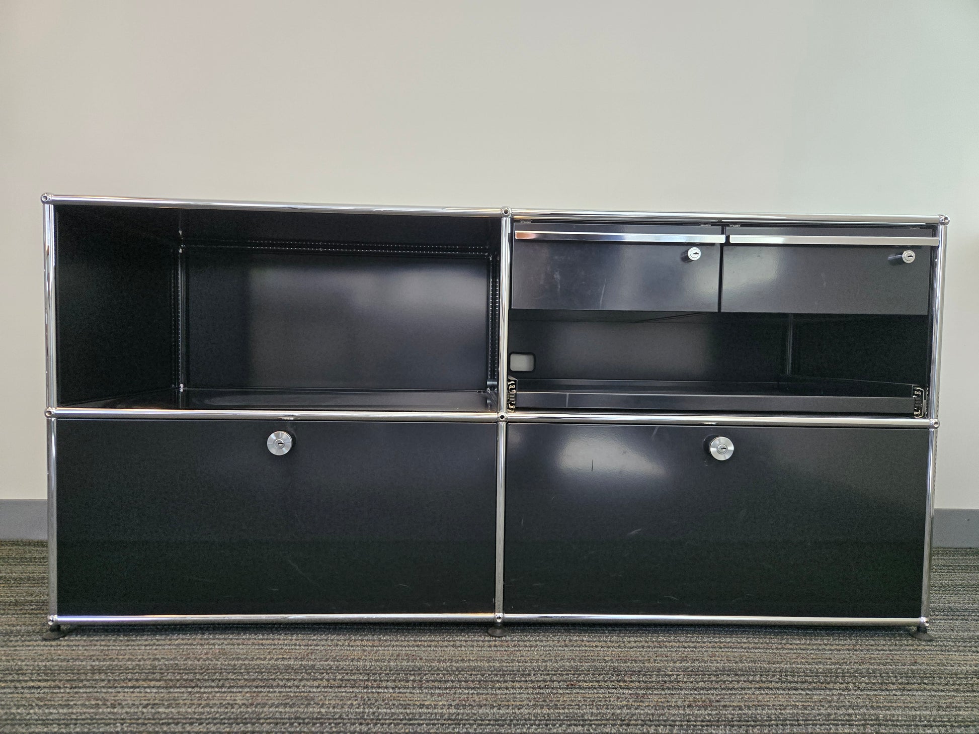 The USM Haller 2x2 Cabinet in Black with 1 Open Shelf and 4 Drawers combines timeless design with versatile storage. Built on USM’s signature modular steel frame with a polished chrome finish, this piece features four drawers—two standard and two half-height—alongside an open shelf for display or easy access storage.