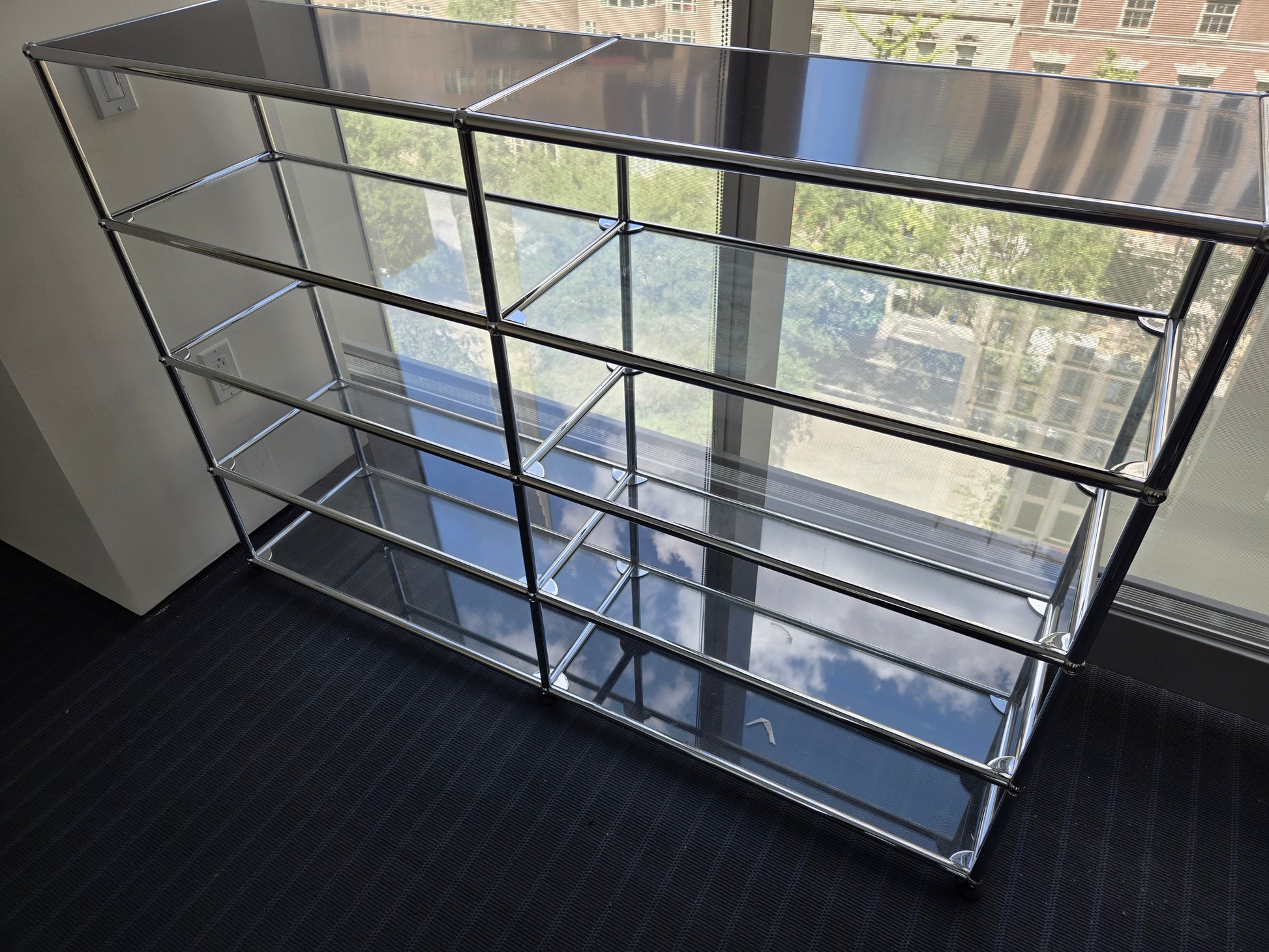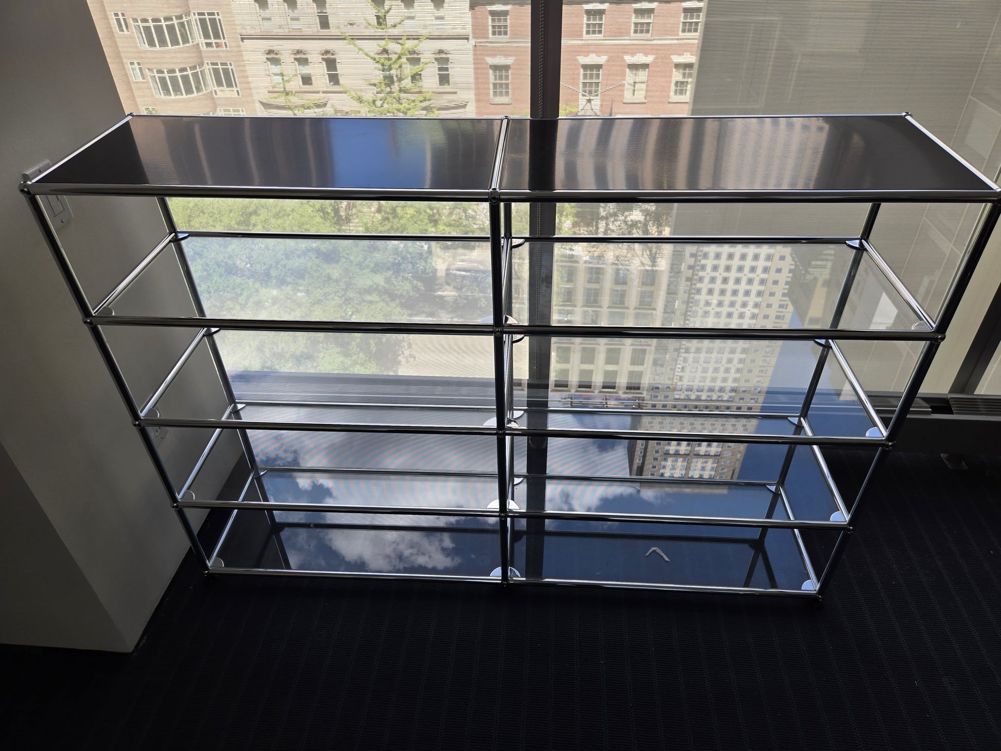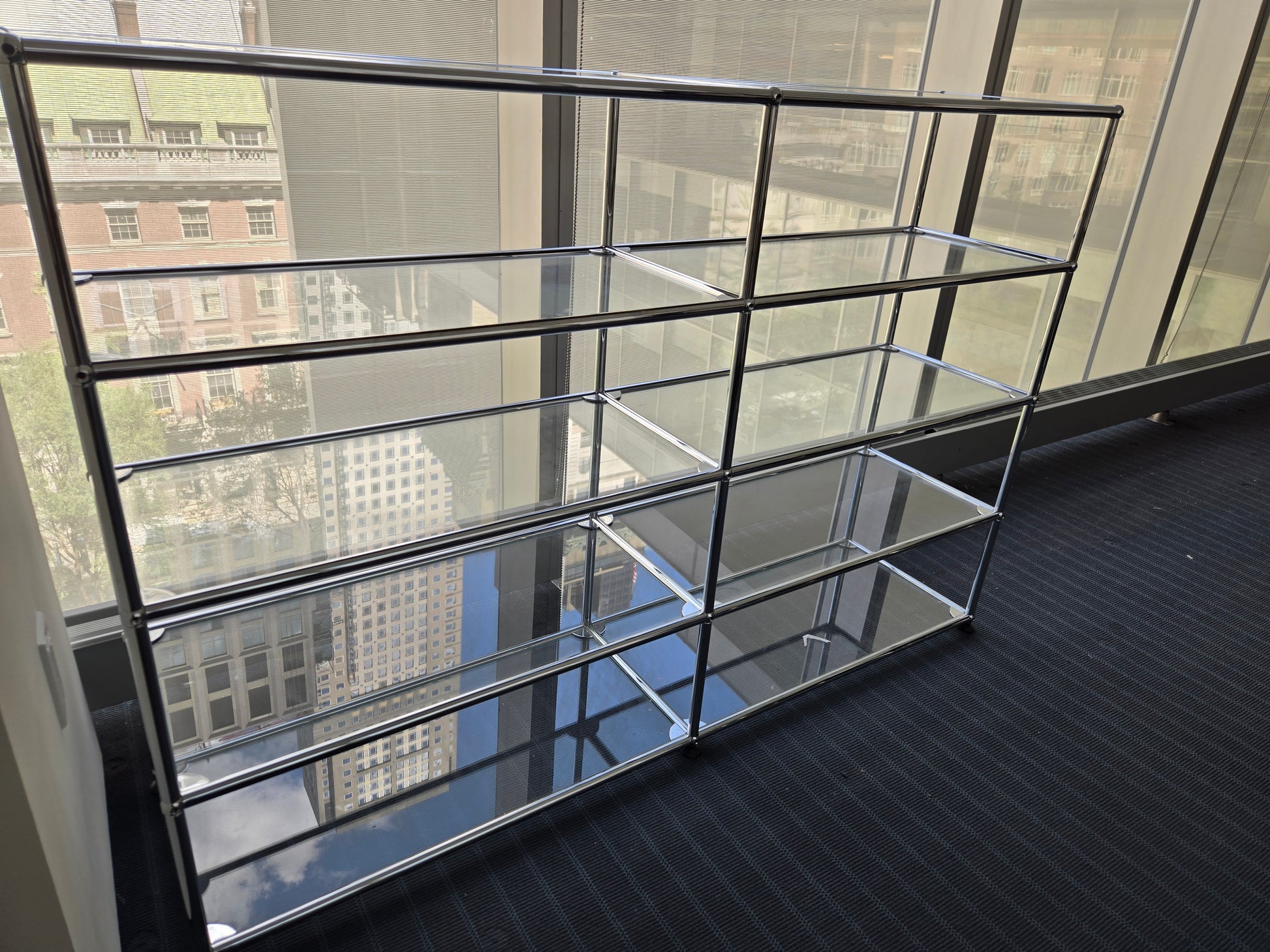 The USM Haller Bookcase in Glass with a Black Top is a refined example of the iconic modular system designed by Fritz Haller and Paul Schärer. Built on USM’s signature chrome-plated steel frame with precision ball-joint connectors, this configuration uses transparent glass shelves that give the piece a light, architectural quality while maintaining strength and stability.