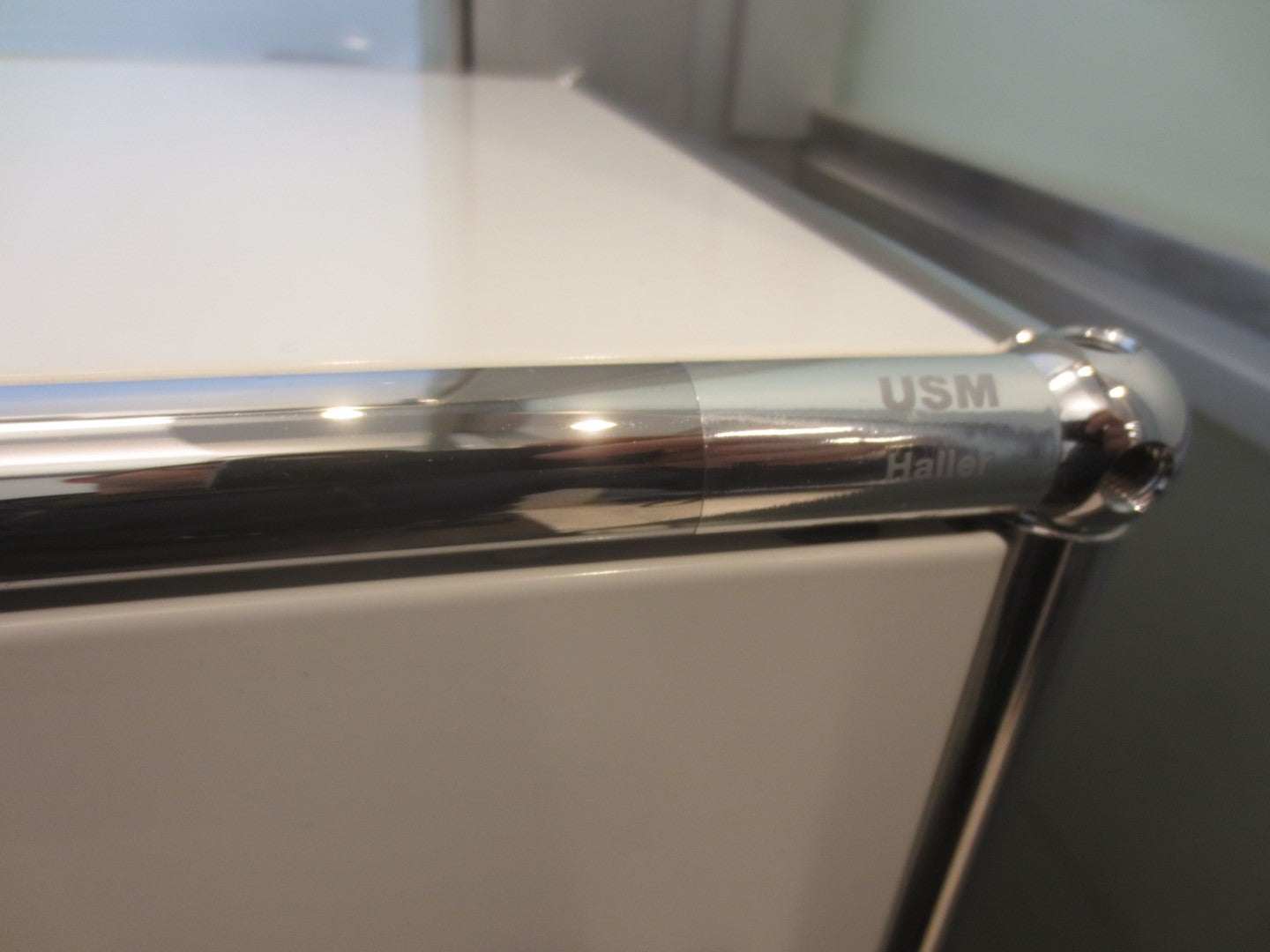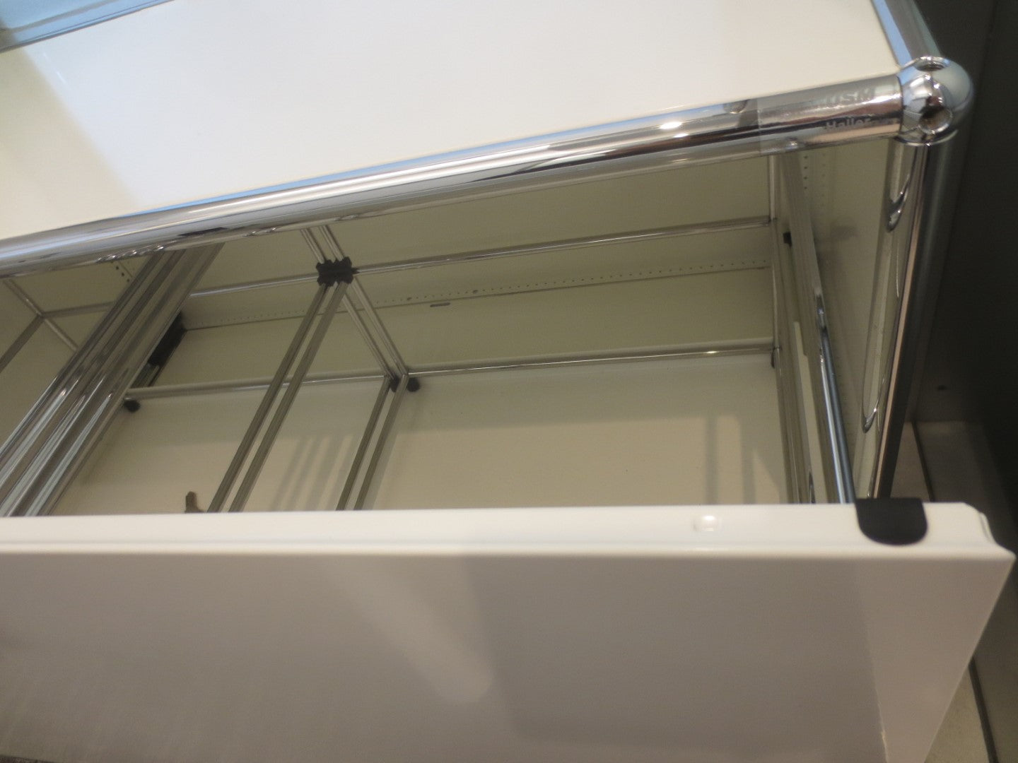 This USM Haller 2x2 Cabinet / Console in White with four drawers features a clean, modular design that’s both highly functional and timeless. Finished in classic white powder-coated panels with a chrome-plated steel frame, it offers generous concealed storage while maintaining a light, architectural presence.