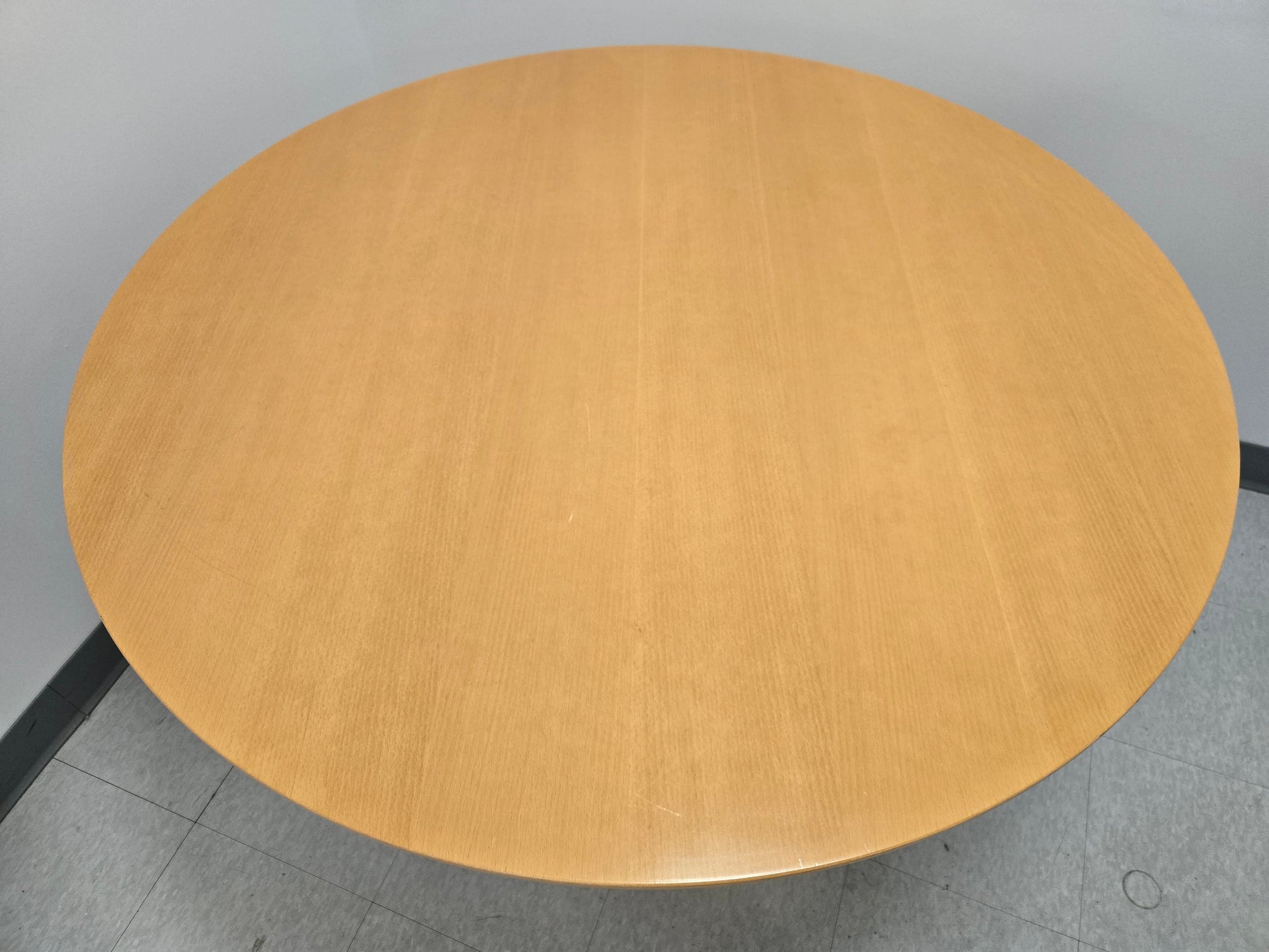 It features a natural beech veneer top supported by USM’s signature chrome-plated tubular frame with a central column and four-star base on casters. The round design makes it an ideal choice for collaborative work, conference rooms, or dining spaces, offering both flexibility and a clean, modern aesthetic.