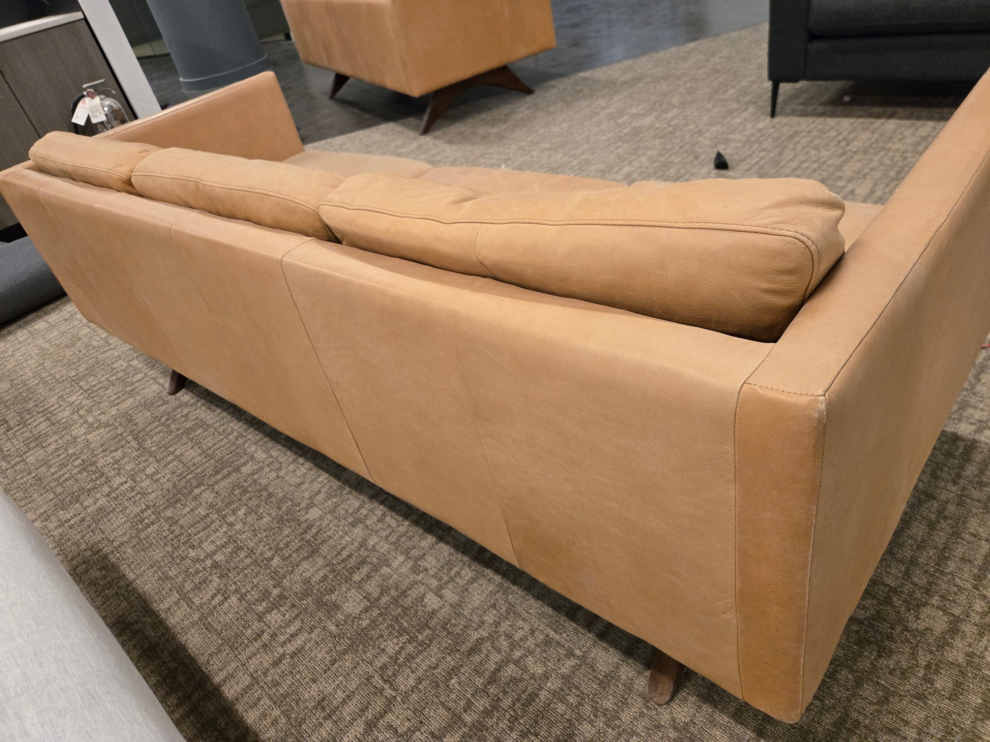 The Brooklyn 81-inch sofa in sienna leather from West Elm delivers a sleek, modern silhouette wrapped in warm top-grain leather. Crafted with a kiln-dried solid and engineered hardwood frame, the sofa features webbed seat and back support and sits upon distinctive wood boomerang legs in a walnut finish.